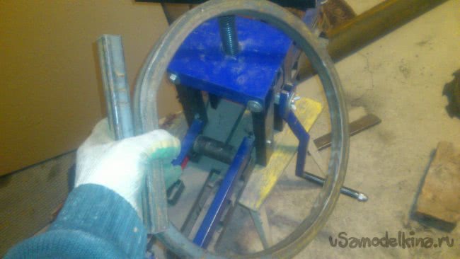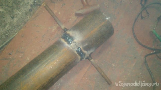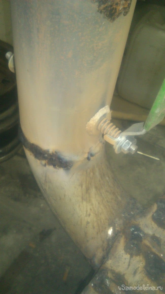 Теперь этим раструбом дымоход будет плотно одеваться на участок трубы над заслонкой. Для удобства установки/снятия я приварил два рычага-рукоятки из стальных прутов, нашедшихся в металлоломе: