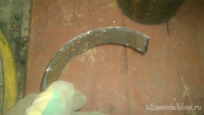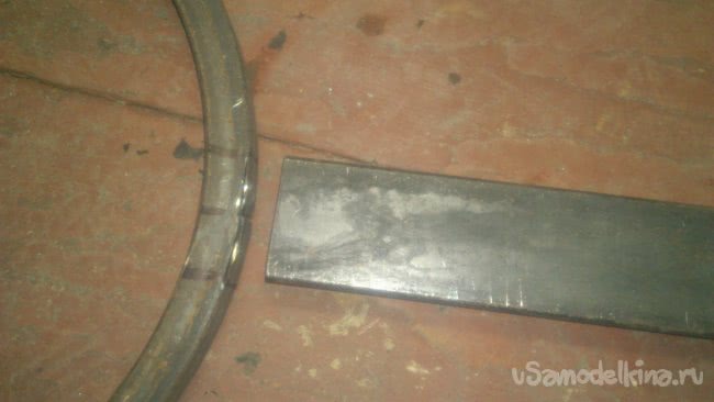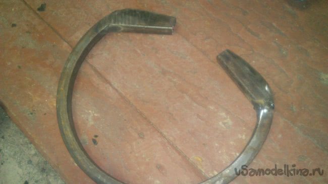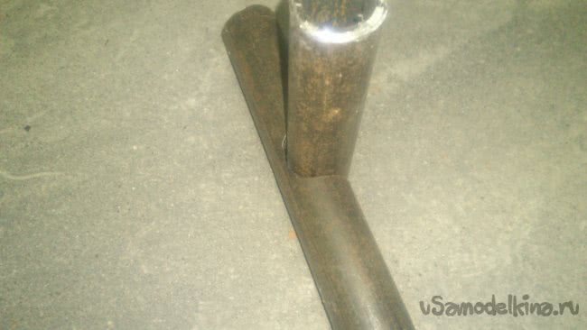 Разогнул немного, набил на трубу (примерно на 5 см) и приварил, вложив в образовавшуюся щель кусок полосы 25х4. (Примерно как раз и вошла. Чуть-чуть подпилил):