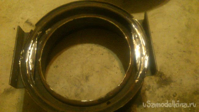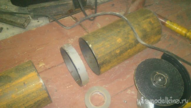 Вырезанное по изоленте кольцо разрезал надвое и приварил внутри трубы - это будут упоры для заслонки, являющиеся одновременно и ограничителями её поворота до девяноста градусов, и уплотнениями при её закрывании