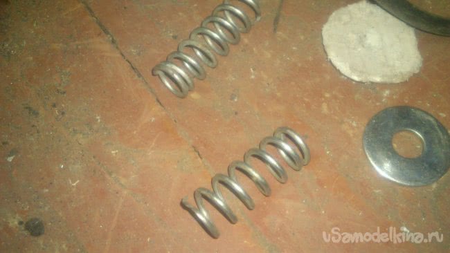 Вот так и собрал уплотнения - в асбестовых кружочках проколол отверстия, плотно насадил их на торчащие с обеих сторон трубы шпильки , потом одел шайбы, пружины, ещё по одной шайбе, и зажал гайками. Теперь сжатые пружины будут плотно "обсаживать" асбест по шпильке (Для этого я в самом начале убрал закругление и сделал ровные площадки в этих местах трубы). Кроме того, пружины не позволят заслонке болтаться - можно будет её приоткрывать до любого положения.