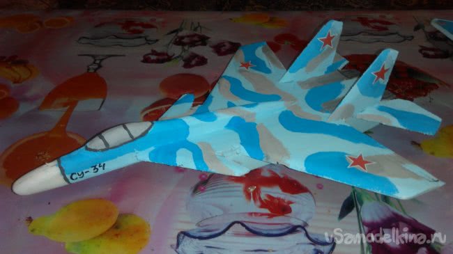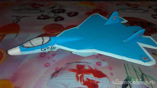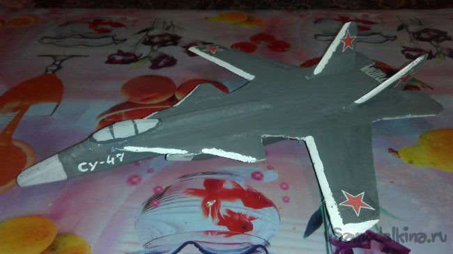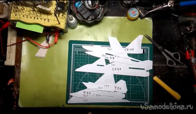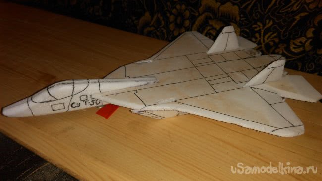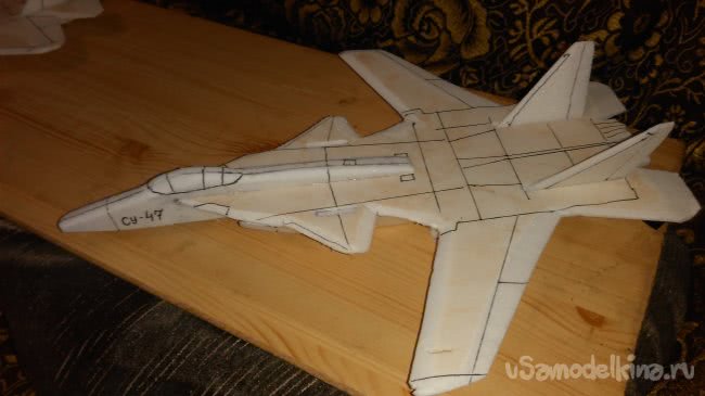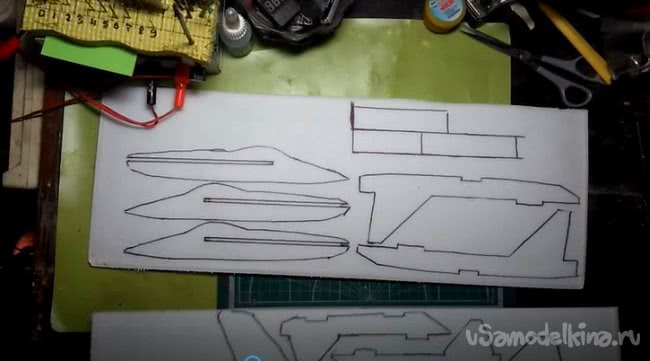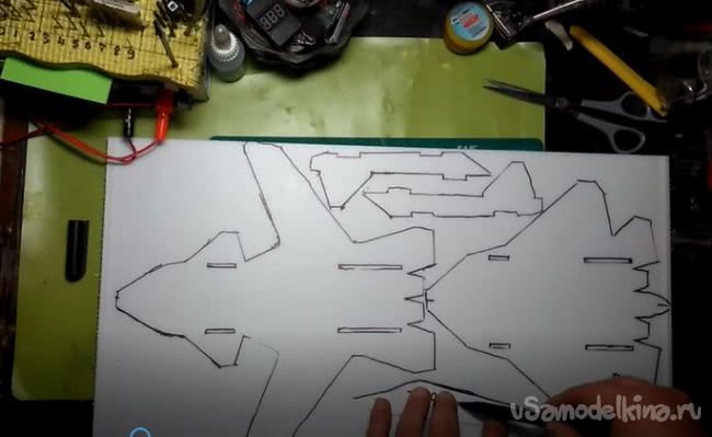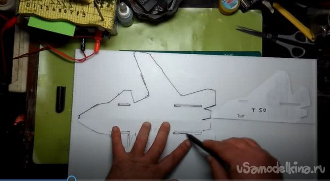 Берем потолочную плитку, желательно без рельефного рисунка, накладываем бумажный шаблон и обводим маркером. Деталь хвостового оперения с двигателем обрисовываем в двух экземплярах.