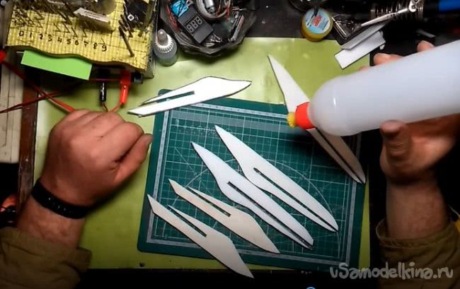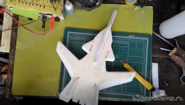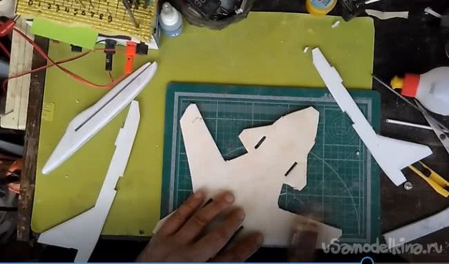 В крыле в пазах для хвостового оперения нужно надфилем завалить пазы под наклоном, чтоб хвосты приняли V образную форму. После начинаем собирать модель (клеем Титан для потолочной плитки).