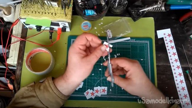 Лицевой стороной звездочку приклеиваем на клейкую сторону скотча и клеим на модель в нужном месте.