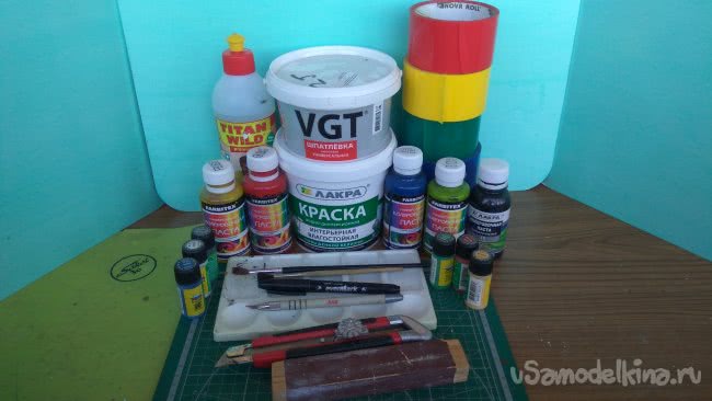 Для замешивания нужных оттенков краски можно использовать школьную палитру , очень удобно. И так, в палитру одноразовой чайной ложечкой наливаем акриловую краску и добавляем пару капель колера нужного цвета и размешиваем, если нужно добавляем больше колера для получения желаемого оттенка. После покраски модели нужно в теплой воде промыть кисточки и палитру с ложечкой, акриловая краска очень хорошо смывается водой.