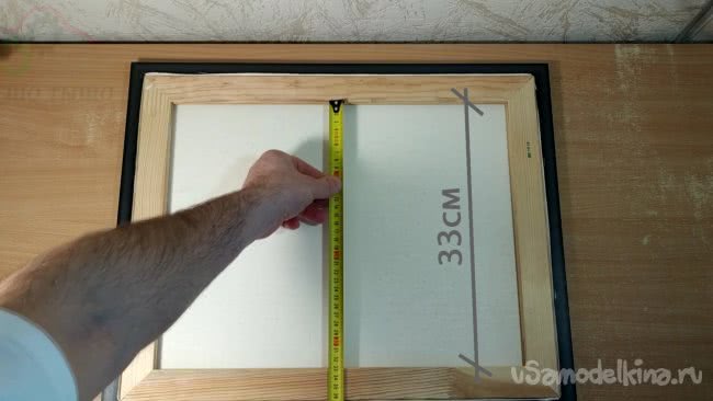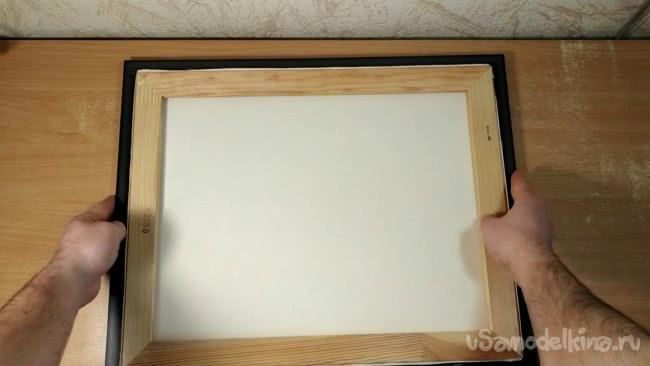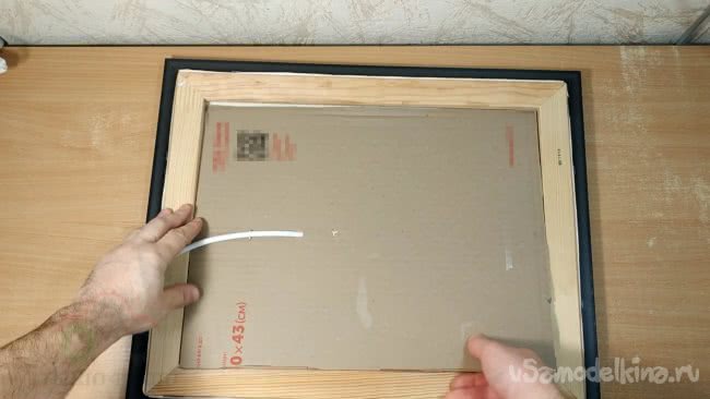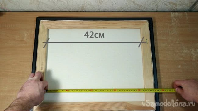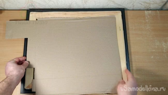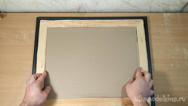 Я отжал у своего сына вполне подходящую картину . В моем случае размеры внутренней части составили 42см в высоту, и 33см по ширине. Я вырезал лист картона по этим размерам и он плотно вставляется с обратной стороны картины.