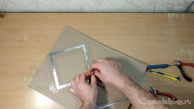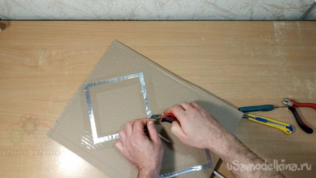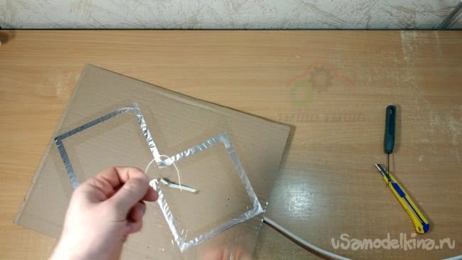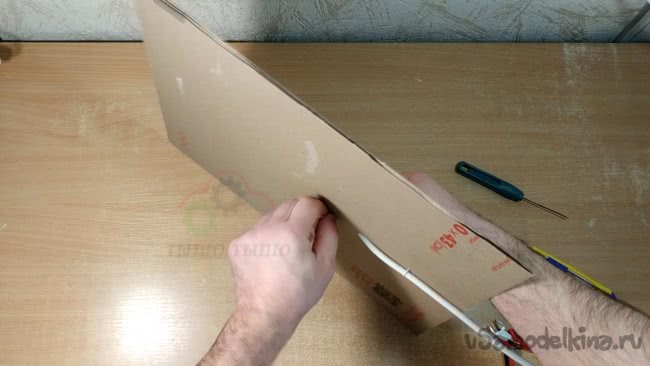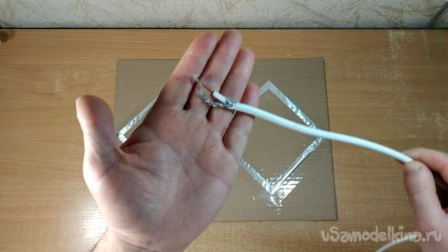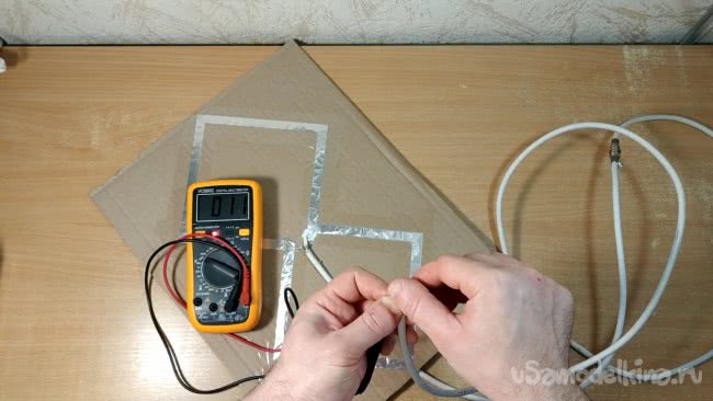 Я прорезаю в картоне отверстие и продеваю через него кабель. Закрепляю кабель небольшими отрезками проволоки в нескольких местах, подведя конец кабеля к внутренней части антенны. Желательно закреплять уже зачищенный кабель, иначе потом зачищать будет неудобно.