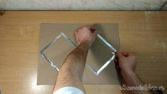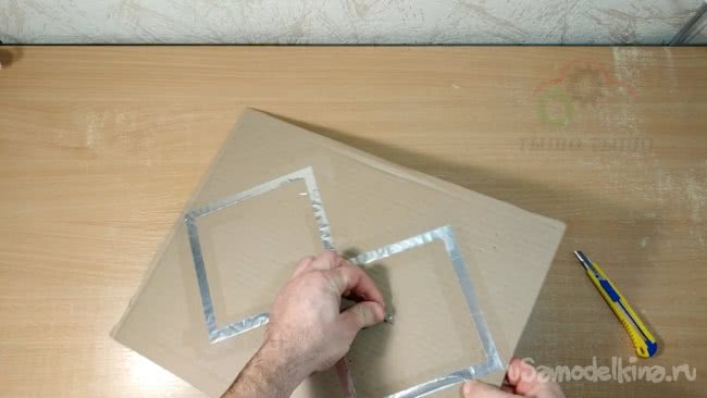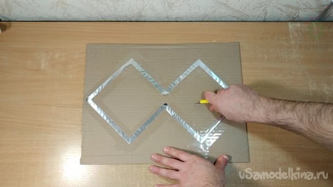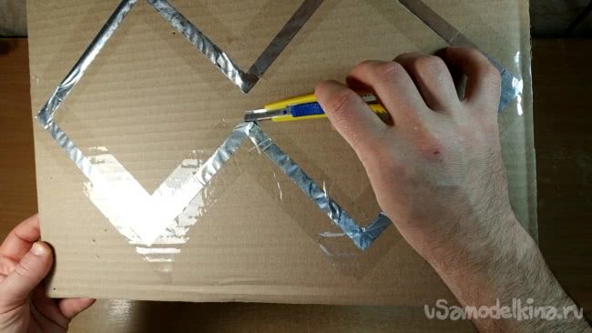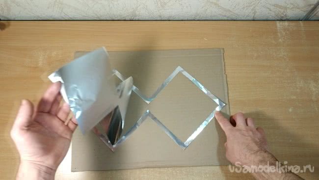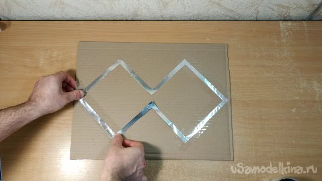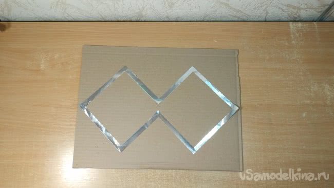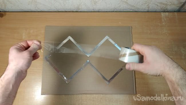 Скотчем нужно аккуратно приклеить получившуюся фигуру к картону который я вырезал ранее. Внутренние части фигуры при этом я оставляю свободными от скотча.