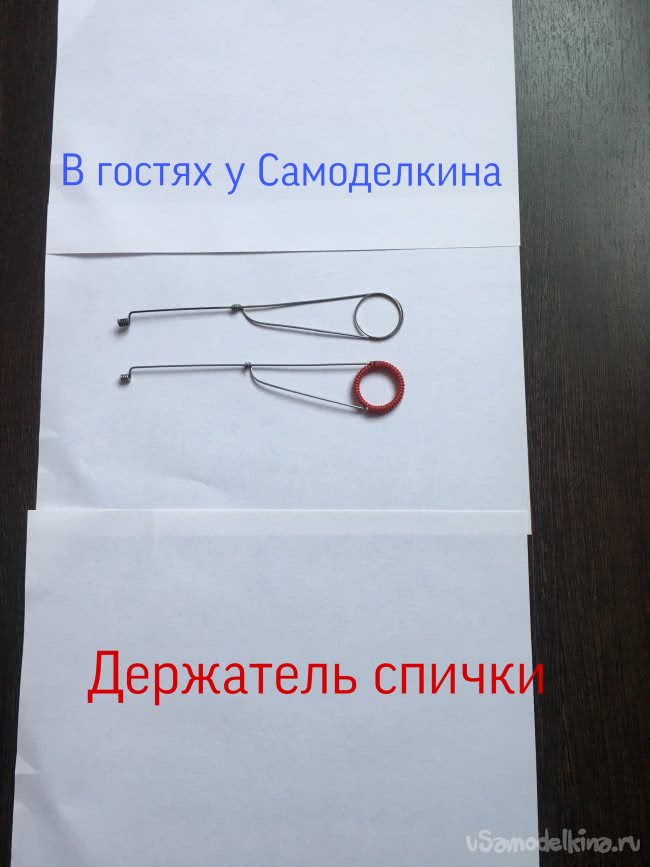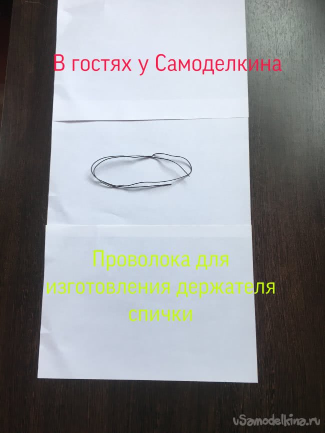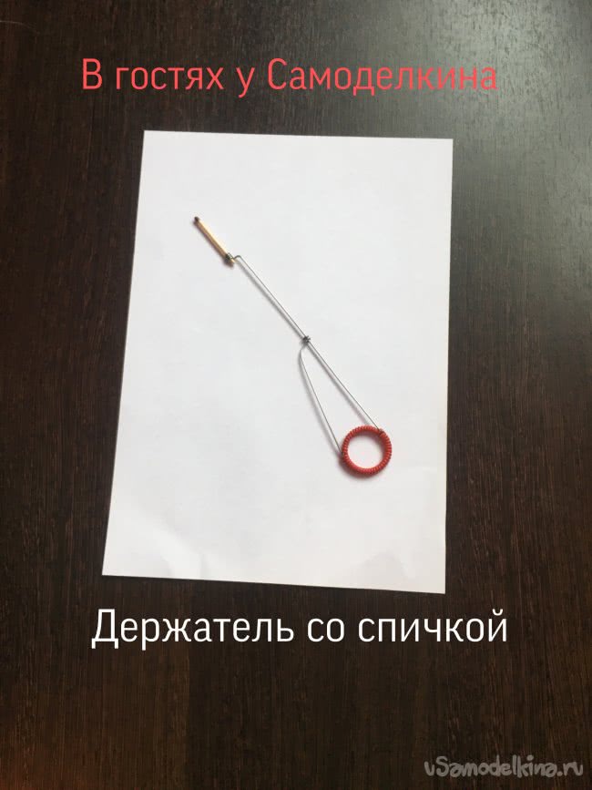 Вначале на гвоздь наматываем примерно 5 витков стальной проволоки диаметром 1,2 мм. При этом витки должны соприкасаться друг с другом. Далее кусачками отрезаем от крайнего витка короткий конец проволоки, а длинный конец-на расстоянии 4…6 мм от оси витка сгибаем на прямой угол в сторону от витков проволоки. На расстоянии 170…190 мм от витков проволоку сгибаем в круг диаметром 30…40 мм на 1,5 оборота и свободный конец проволоки заворачиваем в два оборота на участок проволоки между согнутым кругом и витками. Чтобы удобнее было фиксировать готовый держатель спички пальцами рук, на круговой участок (круг диаметром 30…40 мм) проволоки наматываем медную проволоку с пластмассовой изоляцией. Перед пользованием свободный конец спички вставляется в отверстия витков проволоки.