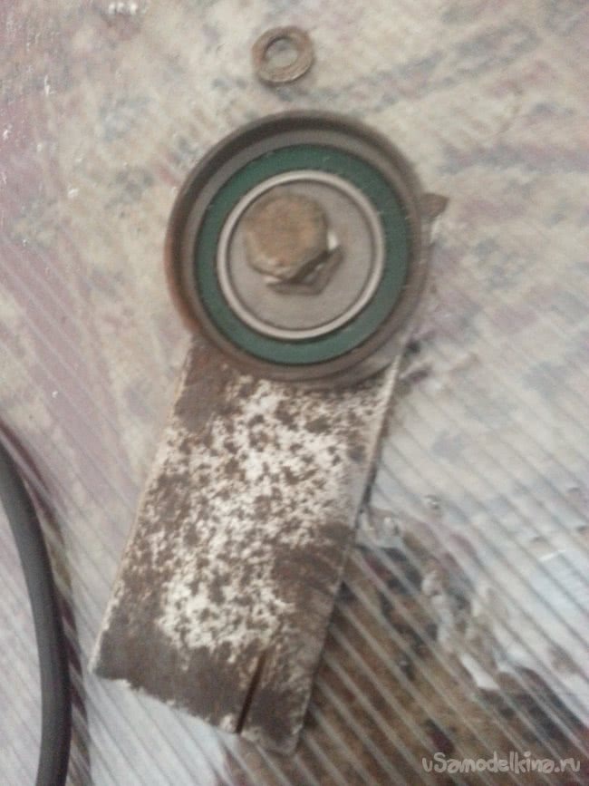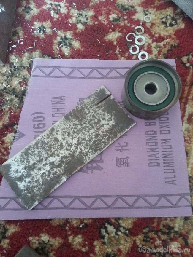 На двигателе есть три шпильки, которые скрепляют двигатель, как раз просверлив отверстия в уголке, закрепляю на две шпильки. Для крепления второго ролика устанавливаю 3‐й уголок, прикрутив его на нижний уголок. Для ролика, как раз у меня остался ролик на машину, я его покупал, но он мне не понадобился, а сейчас как раз пригодился. Для крепления ролика взял пластину 3мм шириной 80мм, а длиной 20 см.