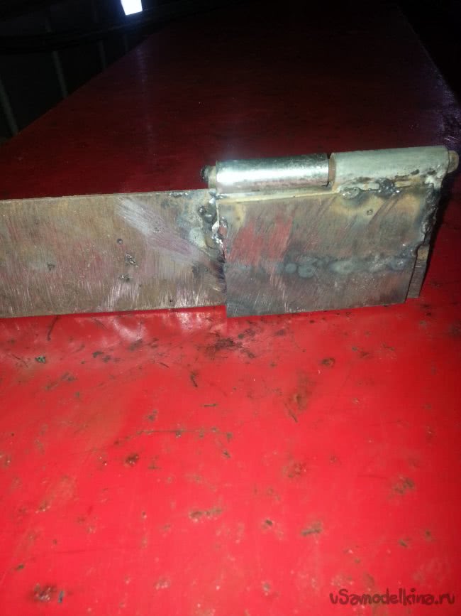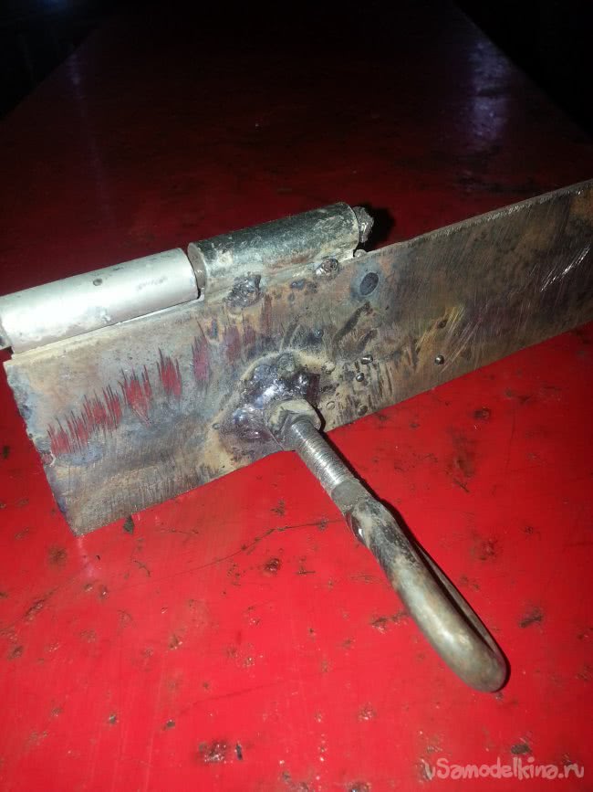 Для регулировки наклона ролика приварил к пластине навес подходящего размера, а к второй стороне приварил кусок металла и просверлил в ней отверстие под болт. Через проставку и шайбу затягиваю ролик крутится легко. С противоположной стороны просверливаю отверстие, привариваю гайку и из проволоки скручиваю подходящей длины крючок и нарезаю на нем резьбу, вот и все механизм собран.