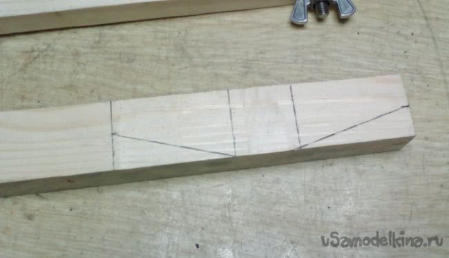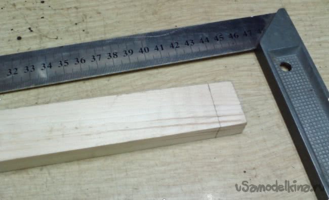 Приступим к изготовлению колодки. Также выбираем материал без сучков и сколов. Размечаем и отрезаем заготовку намеченных размеров. Отмечаем место паза под подвижную штангу разметочного рейсмуса.