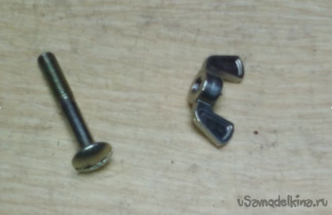 В качестве стягивающего винта подойдет мебельный болт с округлой шляпкой и барашковой гайкой.