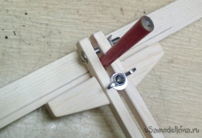 Ввиду простоты конструкции, приспособление очень легко и быстро настраивается. Необходимо только установить карандаш или маркер и затянуть барашковую гайку. Ослабив винт колодки выдвинуть штангу на нужную длину, выставив таким образом нужный отступ карандаша от колодки и затянуть винт колодки. Таким образом они надежно удерживаются от произвольного перемещения и можно не волноваться, что инструмент собьется как бывает при разметке нескольких заготовок.