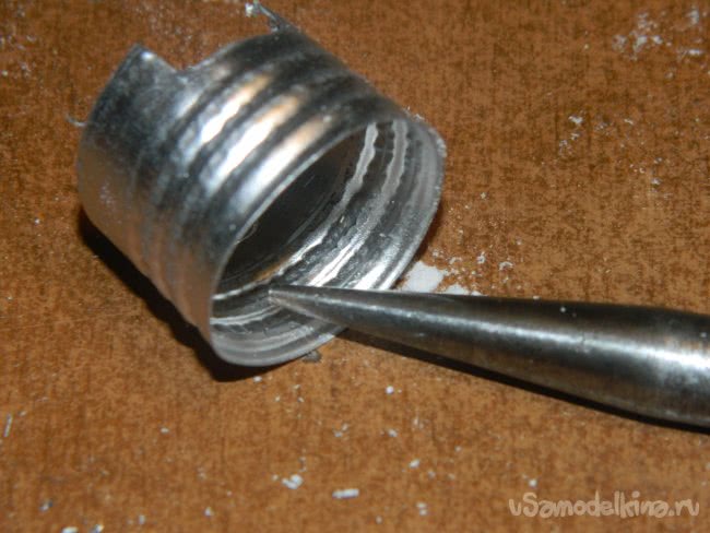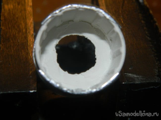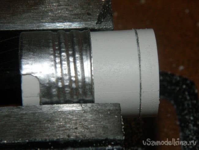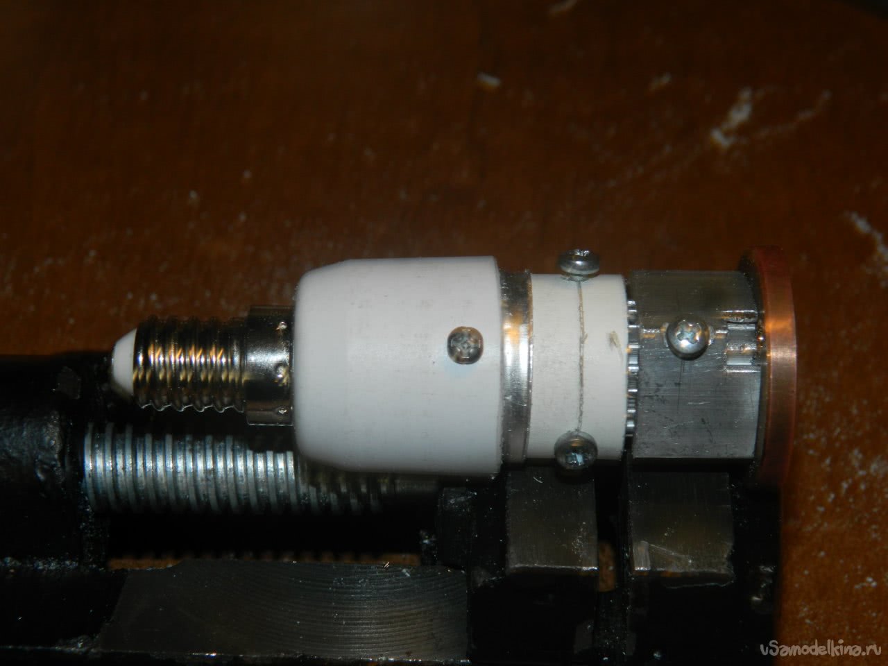 Затем занялся патроном. Патрон входил в переходник с небольшим зазором, и я решил использовать внутренний цоколь переходника, чтобы выбрать его. Чуть-чуть прокатав на плоскости конусным ригелем мягкую сталь цоколя, чтобы сгладить резьбу, киянкой набил его на патрон и срезал места крепления. Потом отметил на патроне кольцо шириной 6 мм и аккуратно отпилил его. Кольцо использовал как дистанционирующую проставку в переходник, чтобы увеличить пространство под драйвер. В заключение бормашинкой убрал с перегородки патрона резьбовую часть, куда вворачивалась лампочка. С патроном закончили.