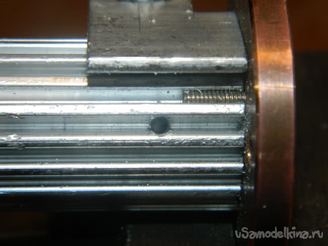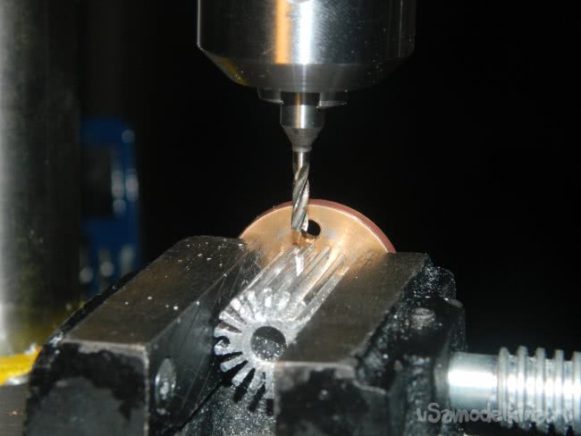 Чтобы уголок, на котором будут клеиться дополнительные светодиоды, имел контакт по большей площади радиатора, отверстие для его крепления следовало сверлить прямо в ребре. Я попробовал сверлить на сверлильном станке сверлом Ø2,5 мм под резьбу М3 — его постоянно уводило в сторону. Тогда я поставил в станок пальчиковую фрезу, зажал в тисках радиатор и, экспериментально подбирая положение, закрепил тиски на столике станка. В результате всё прекрасно получилось! Не меняя положения детали, поменял фрезу на сверло и просверлил необходимое отверстие, в котором нарезал резьбу М3.