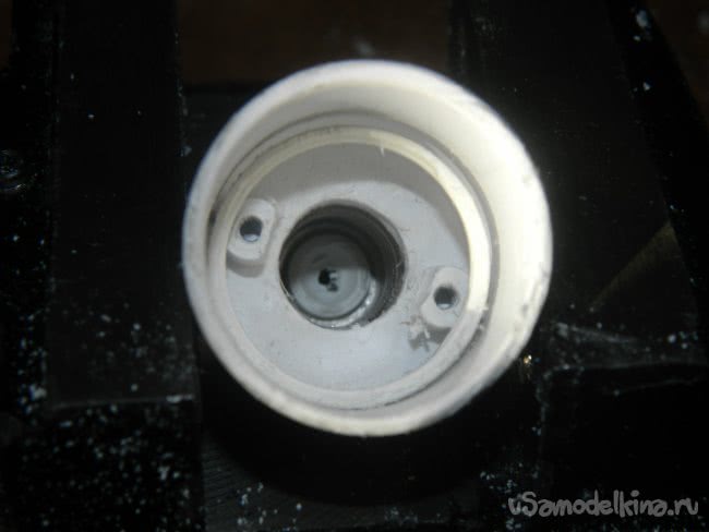 Перебрав кучу разных трубок и муфт, я нечаянно наткнулся на патрон Е14, который идеально подошёл и к драйверу, и к радиатору — радиатор входил в заднюю часть патрона с небольшим зазором, а в переднюю — помещался драйвер. К тому же в патроне внутри была перегородка, которая защитит драйвер от замыкания.