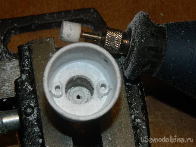 Начал с доработки переходника. Сначала удалил внутренности и бормашинкой с камнем убрал всё ненужное, оставив места крепления, как ножки. Потом высверлил отверстия под провода и обрезал раструб, который мешал.