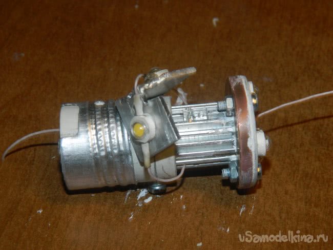 Таким образом, у меня получилась последовательная цепочка из пяти светодиодов. Через термопасту прикрепил уголок на радиатор и собрал полностью лампу.