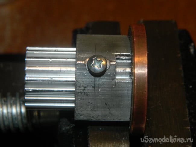 Теперь соберём всё в единое целое. В патроне со стороны радиатора просверлил под 120° отверстия, нарезал резьбу М3 и ввернул винтики для его фиксации. Кстати, очень удачно в патроне расположены рёбра жесткости, которые совпадают с рёбрами радиатора.