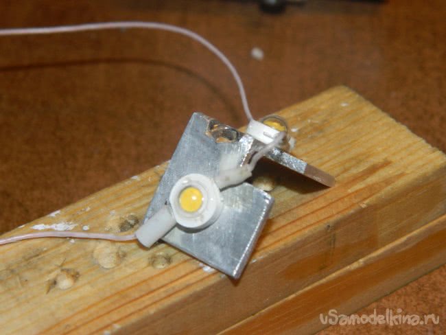 Оказалось, что найти уголок из алюминия — большая проблема. Дюраль мне не годился из-за плохой теплопроводности. Дома я такой уголок не нашёл, пришлось ехать в гараж. Перебрав в гараже все обрезки уголков, я, наконец, нашёл то, что нужно — алюминиевый уголок с полкой 20 мм (и чего только нету в наших гаражах!). Из уголка выпилил радиатор под дополнительные светодиоды и закрепил его на основной радиатор. Так как светодиоды должны быть соединены последовательно, по бокам от уголка просверлил два отверстия Ø2 мм для проводов.