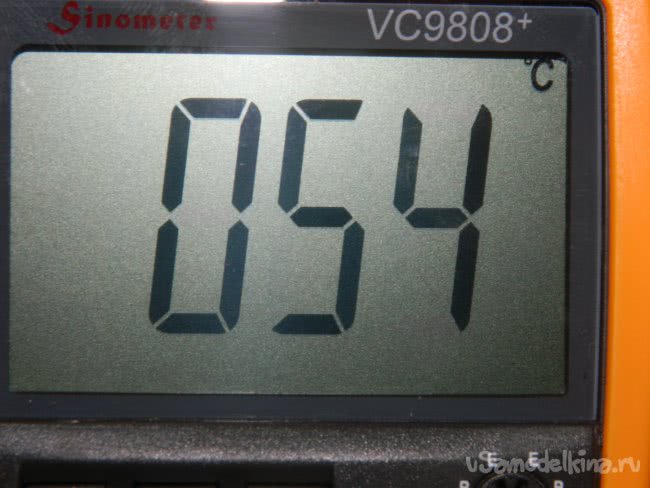 После 35-40 минут свечения лампы мультиметр VC9808+ показал на дополнительных светодиодах (на катоде светодиода) температуру 60°С, а на катоде основных светодиодов — 54°С.