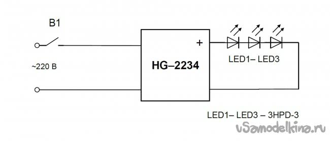• Драйвер HG-2234 с характеристиками: Uвх.= 90-240 VAC; Uвых.= 6-12 VDC; Iвых.= 500 mA; размеры — 25x17x17 мм.
