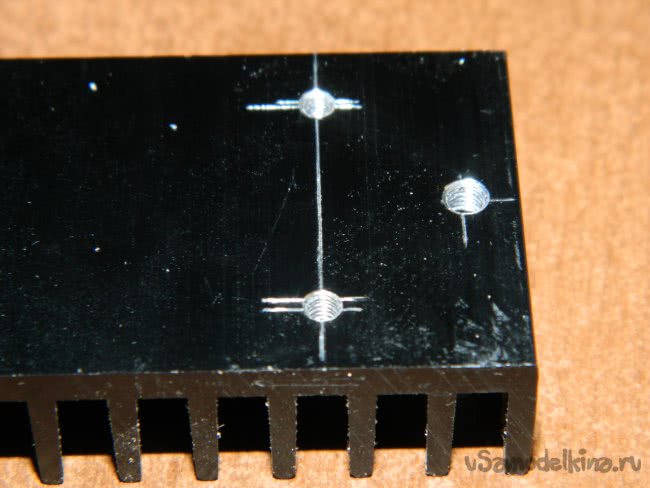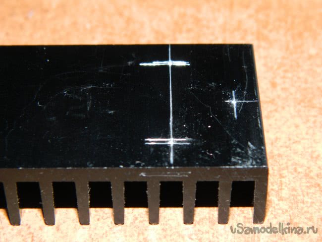 Площадь выбранного радиатора составляет 310 см², что вполне хватает для охлаждения трёх 2-Вт светиков. (Напомню, что для отвода 1 Вт тепла достаточно 30 см2).