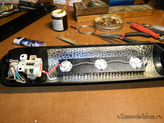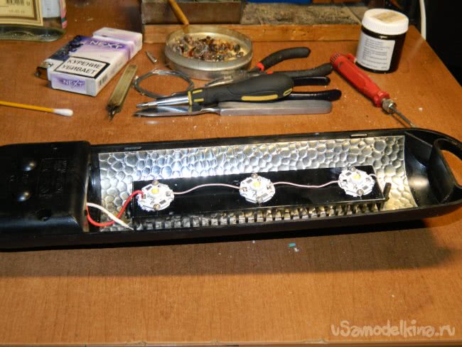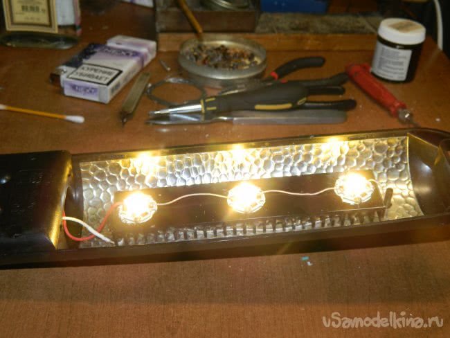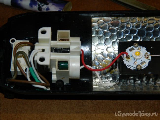 Далее весь монтаж вёл проводом МГТФ 0,17: распаял светики последовательно, выходные провода от драйвера подключил к светодиодам, а входные — подпаял к выключателю светильника. Все соединения изолировал термоусадочным кембриком. Потом собрал светильник, отрезал вилку-дроссель (какое облегчение я испытал!) и поставил обыкновенную вилку — переделка закончена.