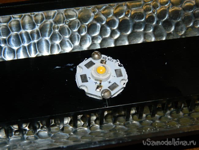 Я напрасно боялся, что вместо термоклея будет использоваться термопаста (да, она имеет тенденцию каменеть через какое-то время — но ЭТО ОЧЕНЬ БОЛЬШОЕ ВРЕМЯ). Во время испытаний измерения температуры на катоде светодиода и на радиаторе было нормальным после продолжительной работы светильника.