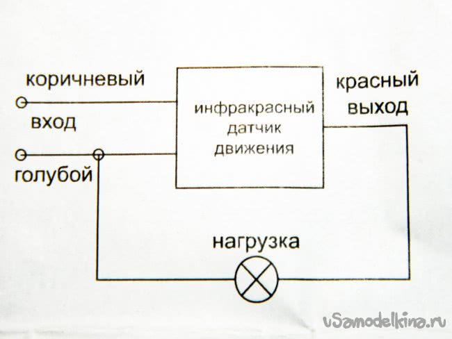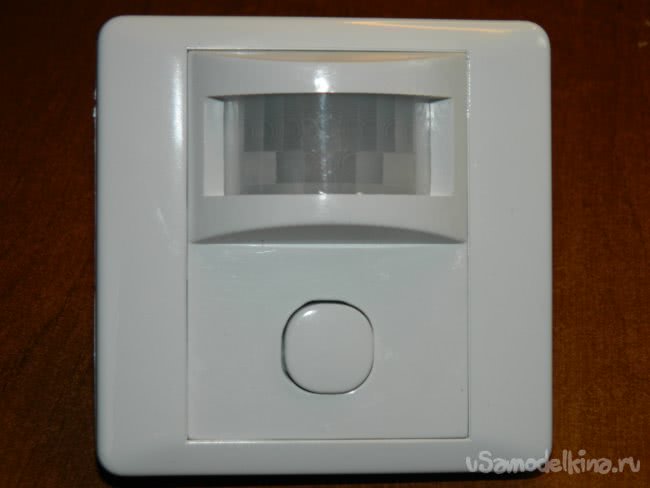 ИК-датчик движения работает по следующему алгоритму. При освещённости более 2-5 люкс датчик ни на что не реагирует. При снижении освещённости в месте установки (наступление темноты) датчик переходит в дежурный режим. При появлении человека в радиусе 1-10 м происходит подключение нагрузки. При удалении человека за пределы радиуса действия датчик снова переходит в дежурный режим. Угол захвата - 120°; мощность нагрузки - 600 Вт; размеры – 87х87х35 мм; высота установки – 1,2-1,6 м. У датчика есть регуляторы времени задержки отключения и освещённости, т.е. его можно настроить так, что он будет реагировать на излучение человеческого тела (10 Нм) и при дневном освещении, и ночью. Схема подключения прилагалась.