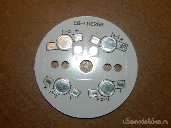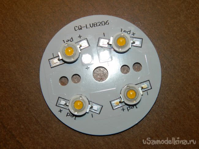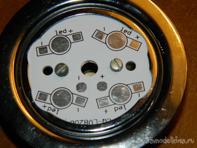Пластина-радиатор представляет собой многослойный круг (как раз под внутренний диаметр стекла мебельного светильника) с теплоотводящими площадками и контактами для пайки четырёх светодиодов мощностью 1 Вт, соединённых последовательно. Я поступил по проверенной схеме – наклеил на пластины светодиоды и положил их на просушку.