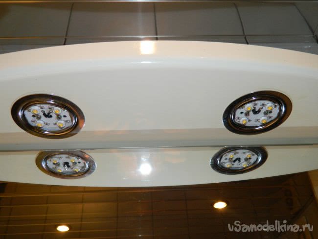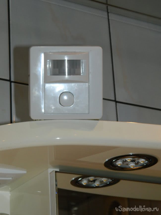 Далее приступил к сборке всей конструкции: собрал и закрепил на место светильники, установил на козырёк датчик, драйвер поместил в закрывающуюся нишу для электронного трансформатора и аккуратно развёл проводку. Всё готово, можно приступать к испытаниям.