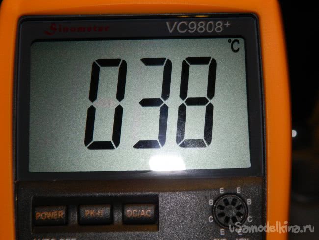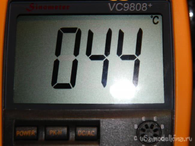 Я поставил время задержки выключения на датчике на максимальное значение 10 мин (но всё равно периодически пришлось заходить в ванную, чтобы датчик не выключался) и приступил к замерам температуры (измерения проводились мультиметром VC9808+ непосредственно на светодиоде). Они показали, что её нарастание идёт не так, как на кухне в закрытых светильниках. Температура плавно возрастает в течение 30-35 мин. до значения 38°С, в последующий час поднимается до 44°С и стабилизируется. По справочным данным светодиоды работают в оптимальном температурном режиме.