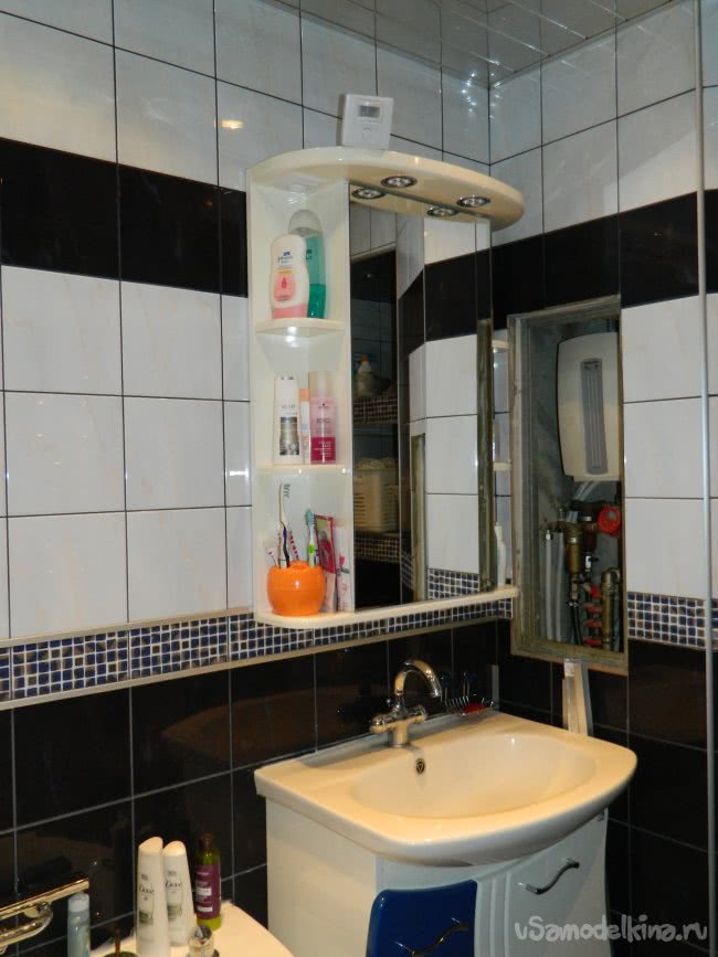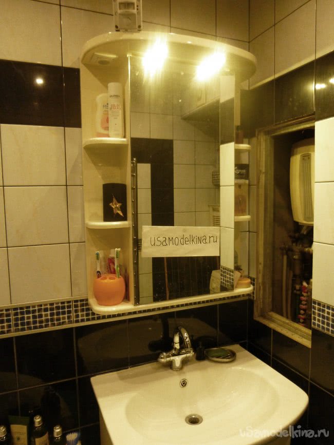 Мне так понравилось работать со светодиодами, что я не удержался и переделал светильники в ванной комнате — встроенные мебельные галогеновые светильники по 20 Вт каждый над умывальником. Дверка шкафчика имела наверху достаточный зазор и затирать светодиоды не должна. Поэтому радиаторные пластины можно ставить на место «родного» стекла – и охлаждение радиатора будет лучше, и не будет сужен угол освещённости. Опыт работы уже был.