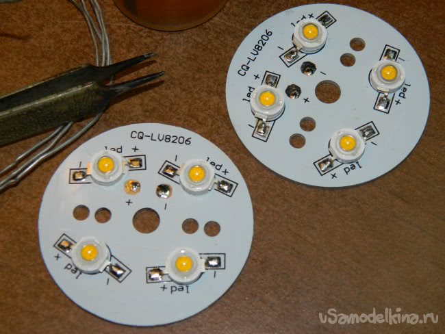 Пока я возился с переделкой светильников и доработкой датчика, клей уже схватился – можно было паять светодиоды на плату-радиатор.