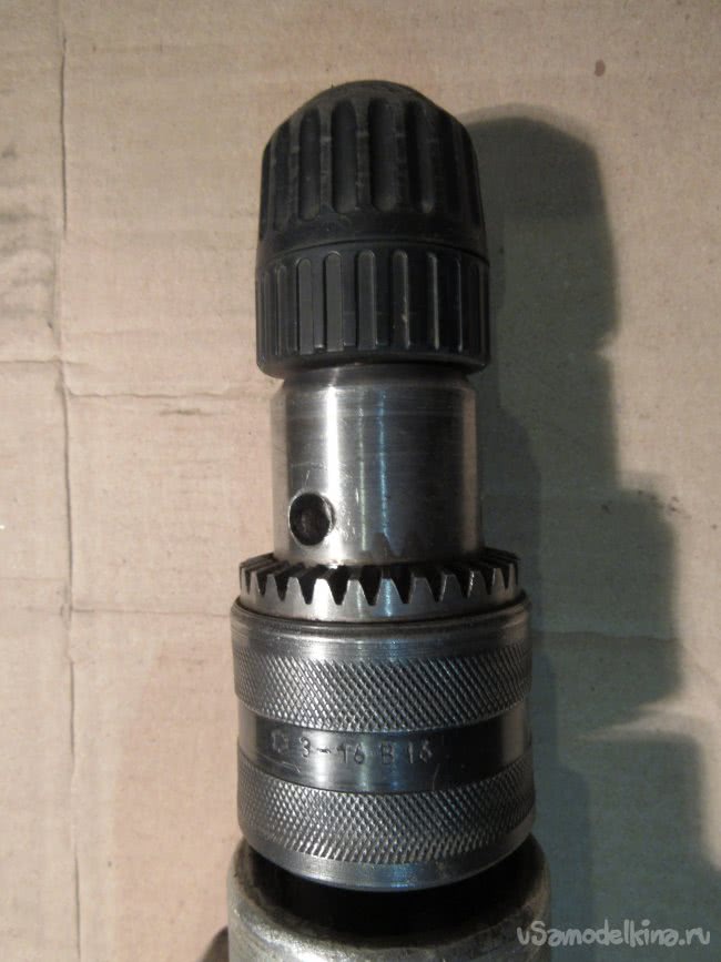 Штатный патрон эл. дрели позволяет зажимать свёрла диаметром 3÷16мм. При необходимости сверлить свёрлами менее 3-х мм. Применяю патрон от когда-то сгоревшего шуруповёрта, отрезав от валика фланец