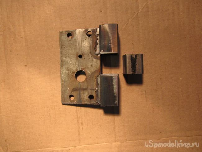 Был заказан у токаря вал с резьбой М16, втулка с внутренней резьбой М16, опорные втулки диаметром 12мм использованы от сайлент-блоков «копейки» (см. фото16). На пластину один швеллер приварен (неподвижные губки). Второй швеллер с приваренной к нему резьбовой втулкой перемещается вдоль вала при вращении воротка (подвижные губки). На швеллеры приварены уголки. На уголки приварены бруски, вырезанные из большого напильника. Между брусками напильника и швеллерами установлен зазор 10мм. Перед приваркой уголков с брусками к швеллерам необходимо предварительно зажать между швеллерами пластину 3÷5мм, подложив между стенками пластины и стенками швеллеров бумагу от принтера, с каждой стороны, сложив её вдвое. Пластина должна выступать из швеллеров на высот у уголков. Это необходимо для того, чтобы верхние губки входили в соприкосновение с зажимаемой в тисках заготовкой раньше чем нижние губки для надёжности крепления. Затем фиксируем всё это струбцинами и свариваем. Качество сборки тисков во многом зависит от тщательности подготовительных операций.
