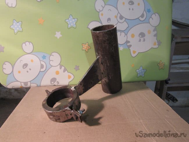 Приваривая к трубе пластину для крепления эл. дрели необходимо выставить её при помощи пакета подкладок разной толщины так, чтобы она была по центру трубы и в плоскости оси трубы, затем зажимаем трубу и пластину струбцинами и привариваем. Точно также поступаем приваривая муфту на конец пластины.
