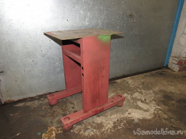 Стойка и домкрат крепятся к станине при помощи болтов. Нижний штатный башмак домкрата отбил молотком, а вместо него приварил пластину с тремя отверстиями (для уменьшения расстояния от домкрата до стойки). При установке домкрата подгибая на кувалде края пластины добиваемся параллельности стенок домкрата и стойки