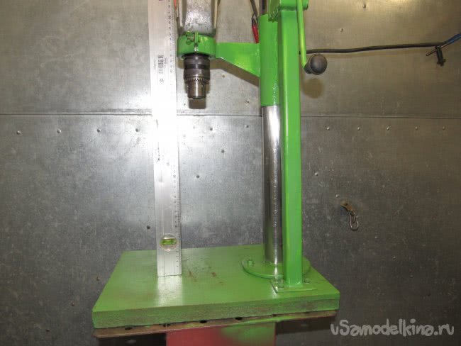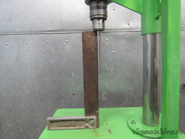 Всё это необходимо делать тщательно, чтобы ось вращения эл. дрели была строго перпендикулярна плоскости станины (грубая подгонка). Окончательная (чистовая) подгонка заключается в подкладке под фланец стойки шайб или фольги с контролем прямого угла между станиной и цилиндрическим телом необходимой длины (трубка, валик) зажатым в патрон эл. дрели