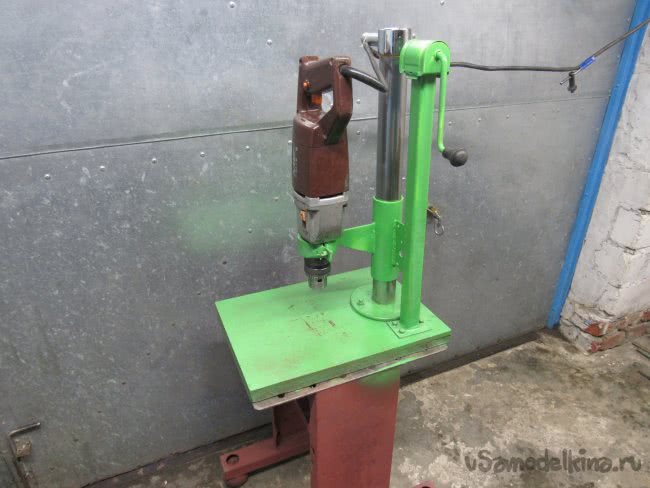 Представляю на Ваш суд самодельный сверлильный станок из домкрата от «жигулей», эл. дрели, трубы водопроводной диаметром 50мм (2 дюйма) – кронштейн для крепления эл. дрели, трубы наружным диаметром 50мм (тонкостенная, бывшая стойка для штанги – спорт. инвентарь) – стойка с фланцем, сгоревшего мармита (от эл. плиты, применяется в столовых, пунктах общественного питания) - станина, ст. пластины толщиной 5мм, половинки муфты от водопроводной тубы 50мм – хомут для крепления эл. дрели (2 дюйма) и прочей мелочи.
