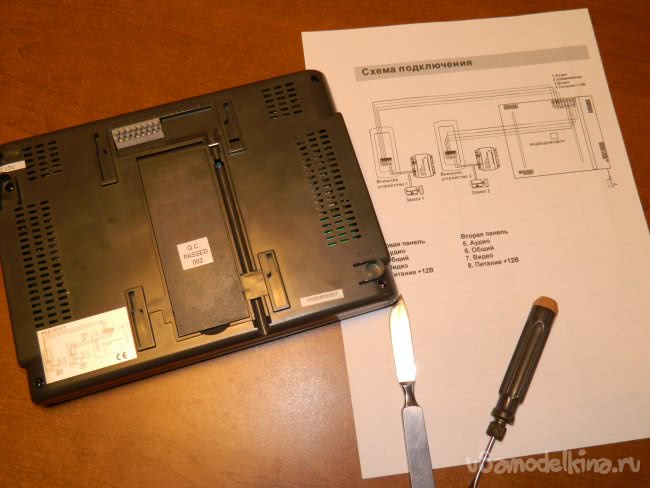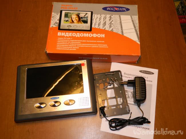 Отрыв коробку я обнаружил: монитор с двумя выходами на камеры и вызывные панели, кронштейн для его крепления на стену (может стоять и на столе), блок питания. В инструкции только не было обозначения контактов (к какому что подключать). Полез в Интернет и скачал уже там всё про свой монитор (оказалось, что он ещё и системы PAL).