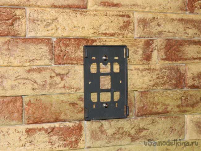 Далее надо было с наружной стороны входной двери установить вызывную панель. Применив прилагающийся к панели шаблон, я разметил на не открывающейся части двери отверстия под крепления панели и выводы проводов так, чтобы расположить камеру на 1,5 м от полу (так было написано в инструкции), просверлил отверстия, закрепил панель на дверь винами М6 и поставил декоративные заглушки.