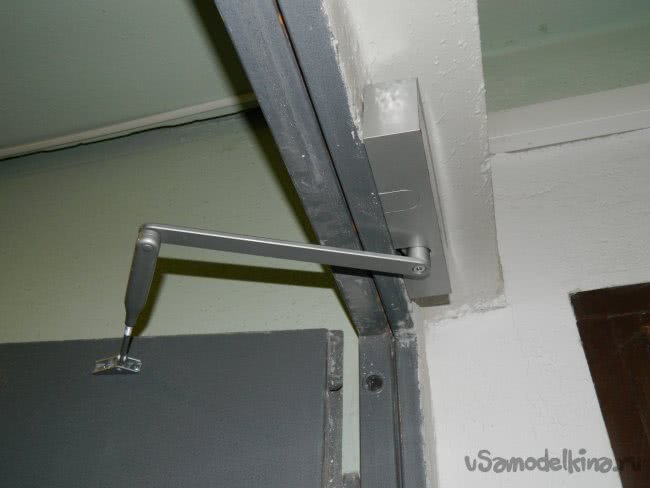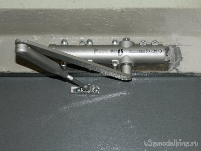 Следуя инструкции с соседом разметили дверь и прикрепили дотягиватель. Винтами, регулирующими скорость закрывания двери и её дохлопа, выставили необходимую и крышкой закрыли дотягиватель.