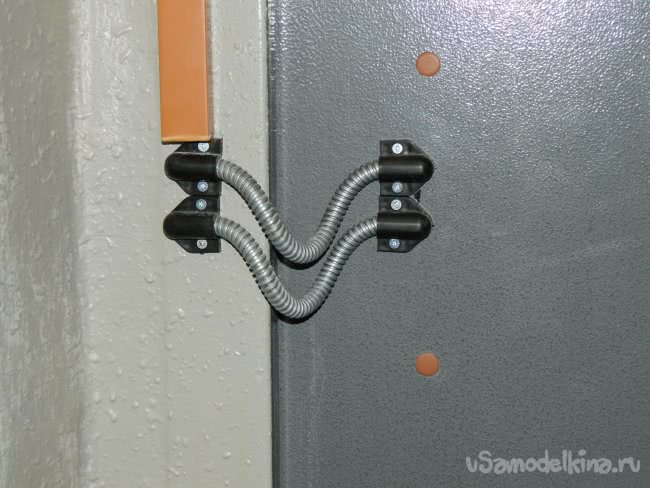 Чтобы в экстренном случае можно было отрыть эту часть двери (пронести крупногабаритную вещь, например, диван), провода от панели вывел при помощи гибкой подводки.