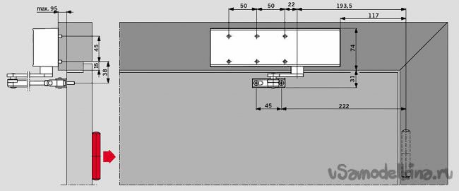 Следующим этапом была установка на дверь дотягивателя. У соседа валялся дотягиватель TS-71 (производства фирмы “Dorma”, Германия»), который допускает регулировку скорости в моменты закрытия и дохлопывания двери. Документов на него не было. Пришлось скачать инструкцию в Интернете (рисунок).