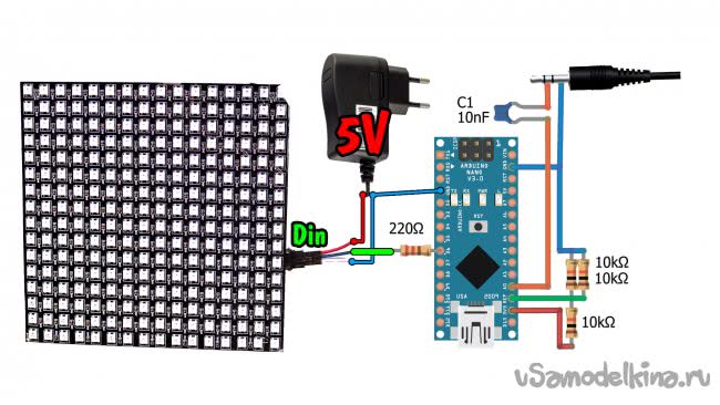 В конечном итоге, вместе с матрицей и блоком питания, схема будет выглядеть так.
