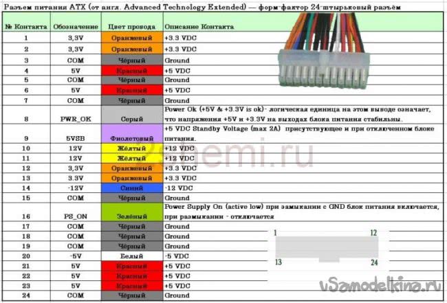 Нам надо лишь его немного переделать. Замыкаем зеленый провод (PC_ON) на землю GND (COM). Это нужно для включения блока питания. Можно вывести удобную кнопку, чтобы каждый раз не замыкать проводком. Фиолетовый провод- это дежурные 5 В (+5VSB), к нему нельзя подключаться, так сила тока там слишком мала. Подключаться надо к красным проводам (+5VDC). Если хотите получать и 12 B, подключайтесь к желтым проводам (+12VDC или 12V1 DC).