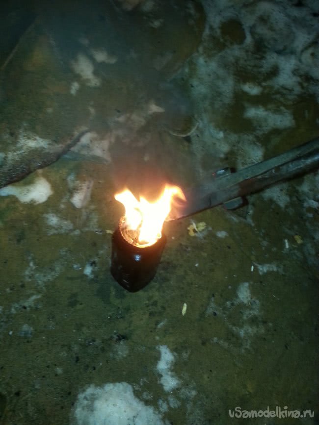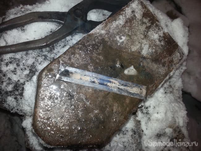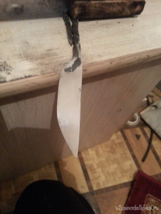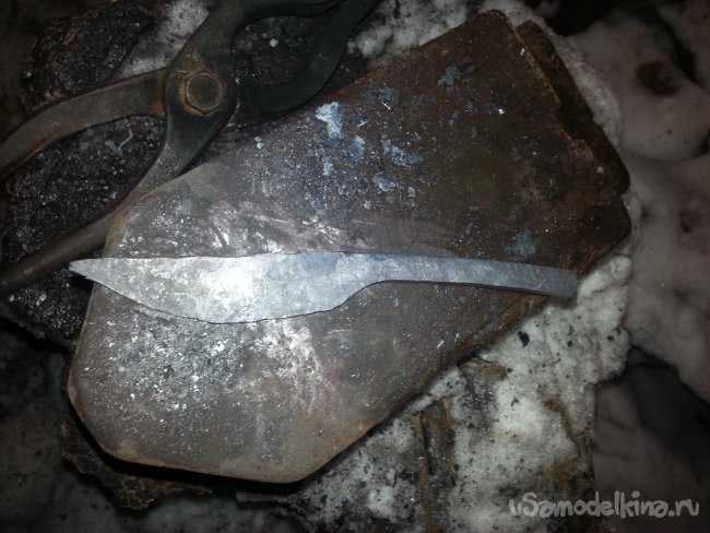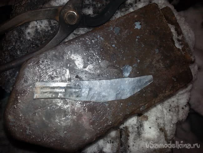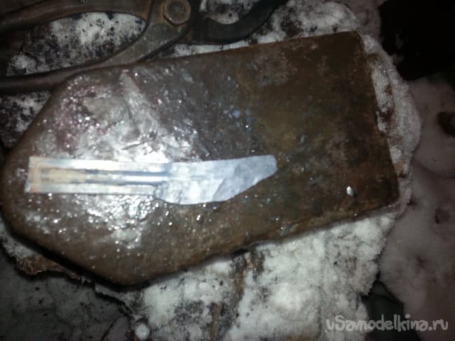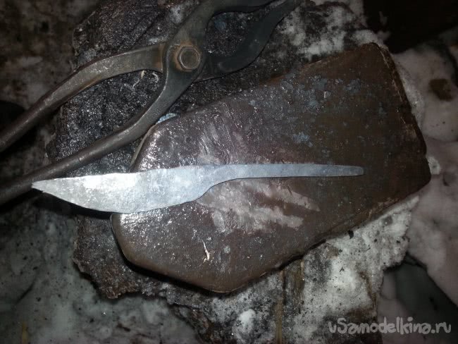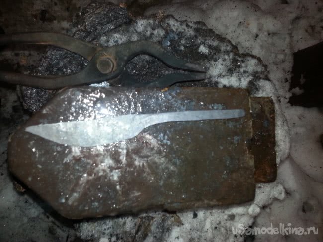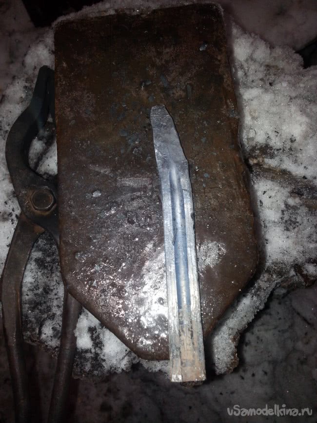 Теперь можно и закаливать нож. Нагреваю до того момента пока магнит не перестанет прилипать к ножу, и окунаю в подогретое минеральное автомасло. После закалки оставляю на выключенном горне, пусть остывает будет как отпуск. Вот и все теперь приступаю к слесарке.