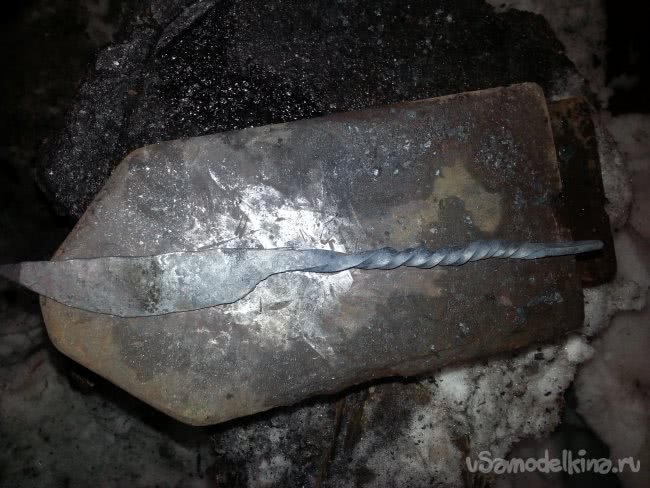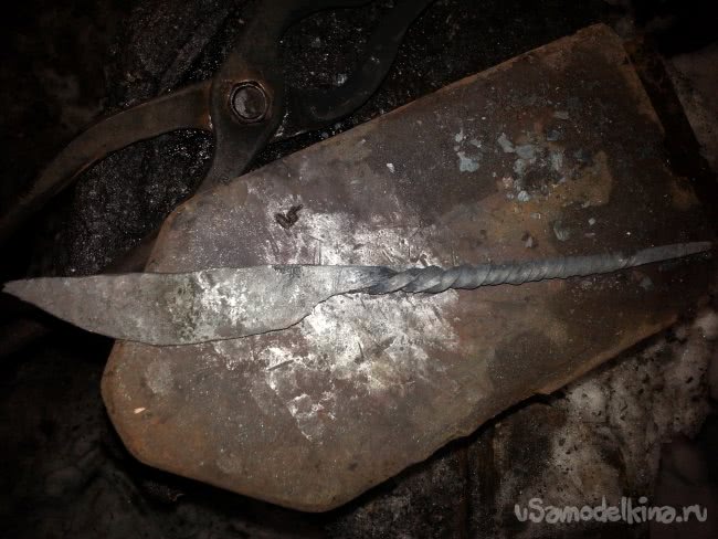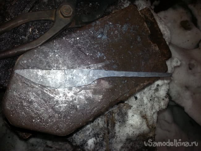 После вытяжки лезвие на обухе 2 мм, а на острие 1 мм я ковал лезвие сразу в готовый вид так, что после ковки буду сразу закаливать нож.